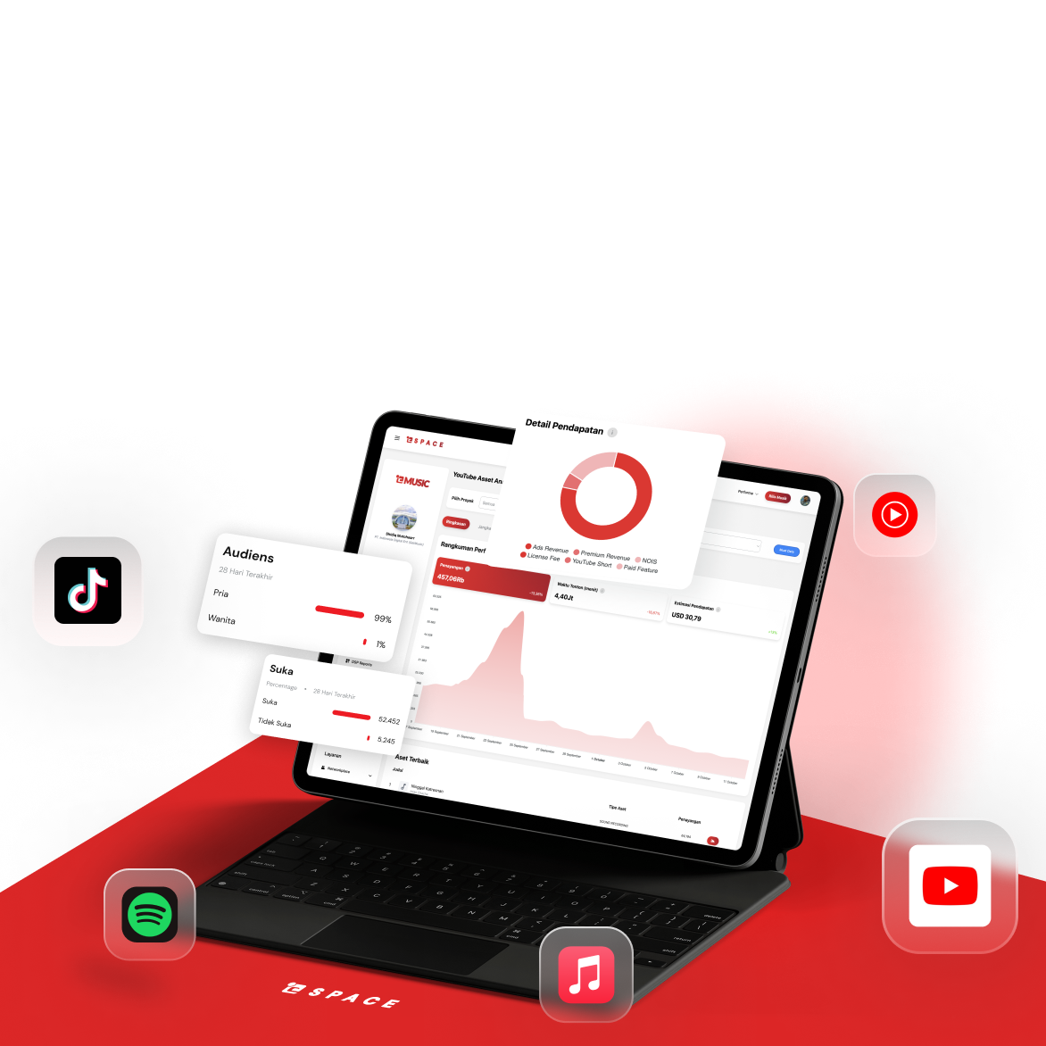 Fitur utama SPACE adalah sebuah dashboard atau sistem untuk mendistribusikan karya musik, menganalisa performa rilis karya, serta fitur dengan beragam informasi yang sangat luas seputar industri musik & hiburan.
